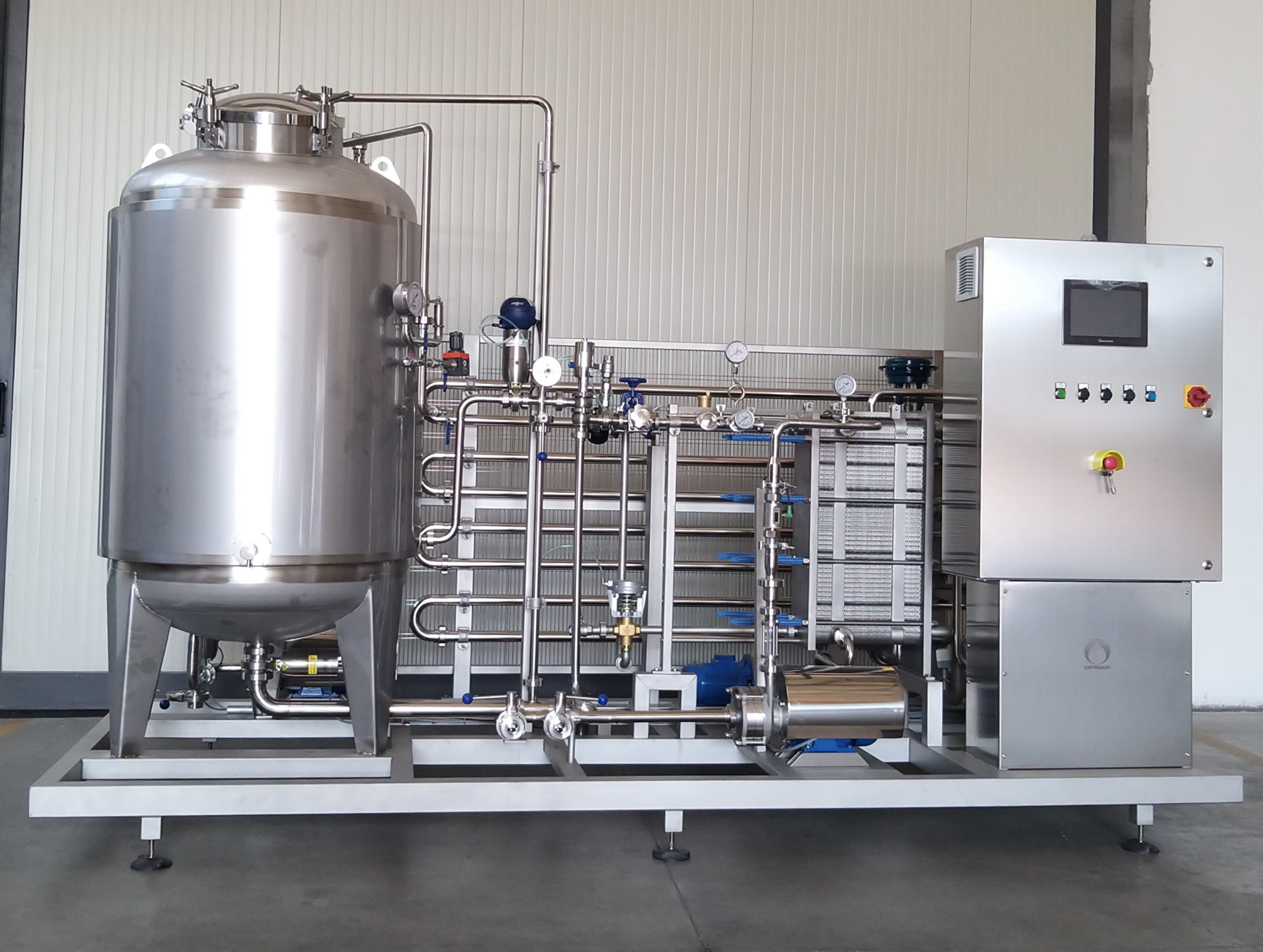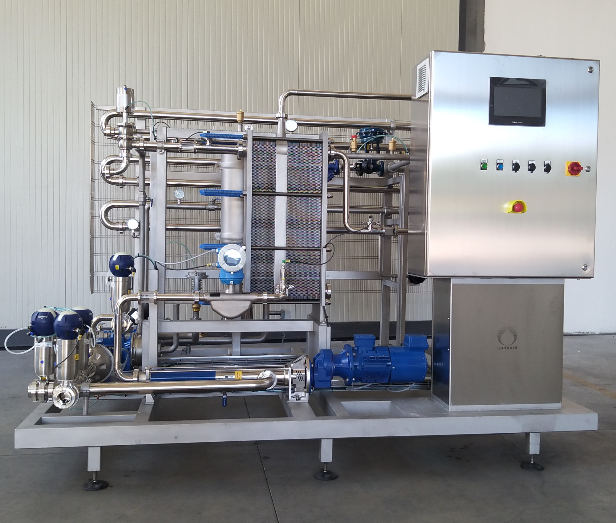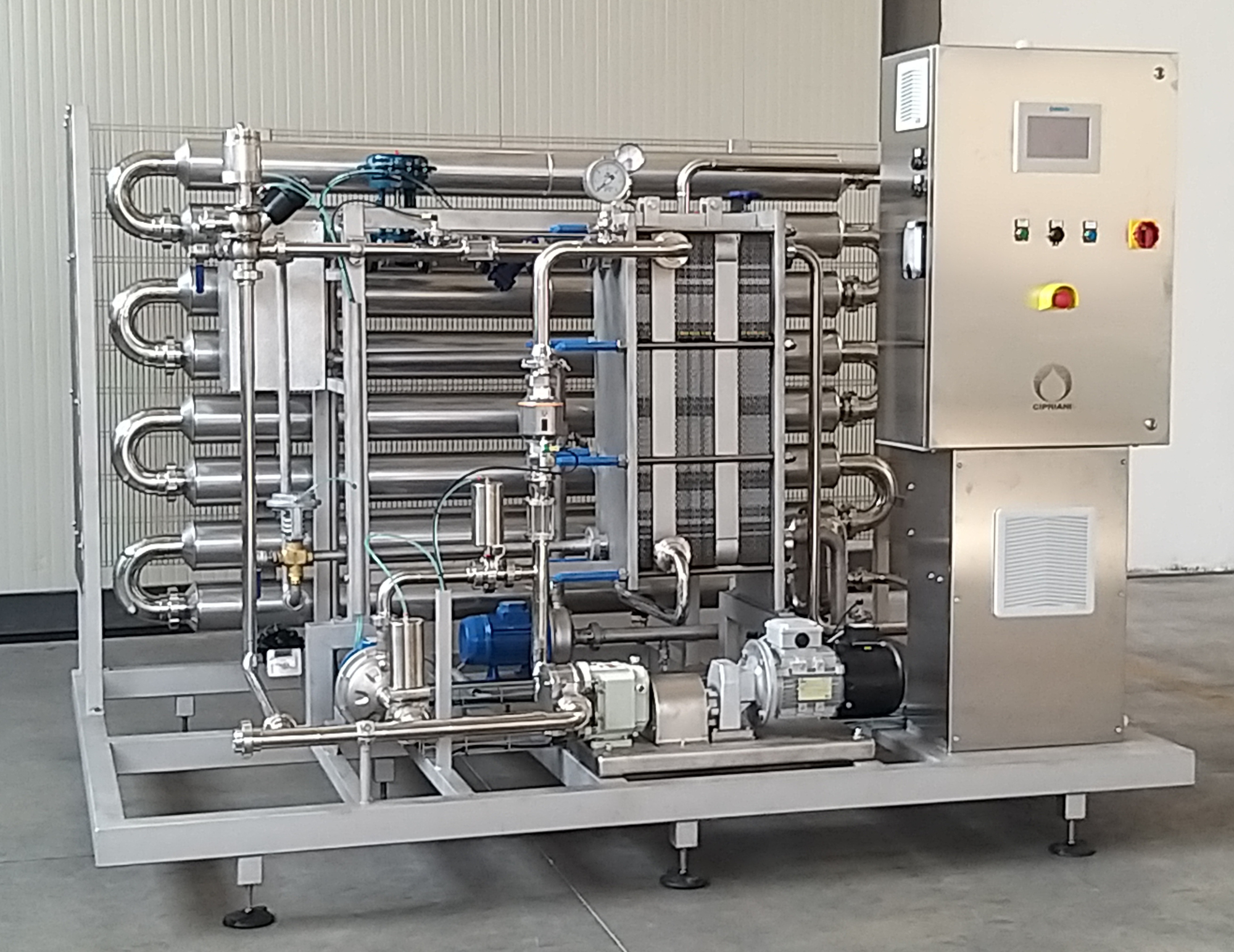 Cipriani Group produces pasteurisation systems with plate heat exchangers, with one or more readily serviceable sections, automatic and semi-automatic functions, also by PLC.